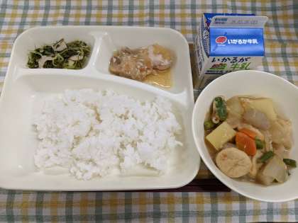 1月30日(木)の給食は「鶏肉のおろしじょうゆかけ、一口がんもとじゃがいもの煮もの、みずなの煮びたし、ごはん、牛乳」です。