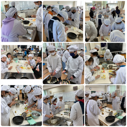 家庭科では調理実習をしました。包丁やピーラーを使ってジャガイモの皮むきをして、ジャーマンポテトをつくりました。ゆでたり炒めたりして調理していました。