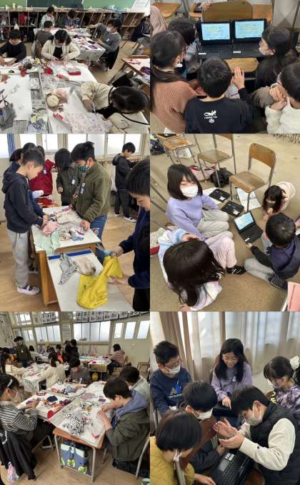 図工では、着なくなった服や麻ひもなどの材料の触り心地や色味などの特徴を活かして作品をつくっています。