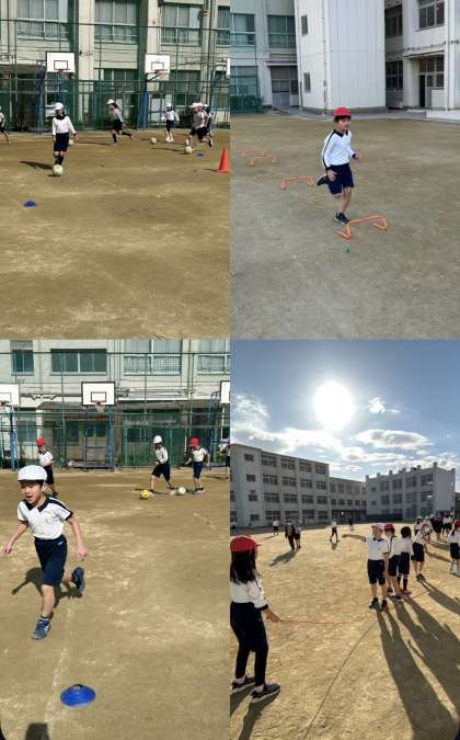 体育では、ハードルとサッカーをしています。まだまだ外は寒いので、怪我をしないようにしっかりと体を温めてから活動をしています。
