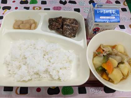 2月3日(月)の給食は「くじらのたつたあげ、豚肉とじゃがいもの煮もの、白花豆の煮もの、牛乳」です。
