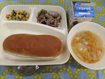 2月5日(水)の給食は「豚肉のオイスターソース焼き、中華スープ、ツナとチンゲンサイのいためもの、レーズンパン、牛乳」です。