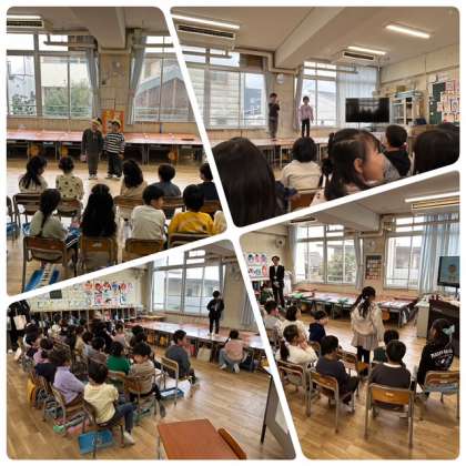 2年生は、町たんけんの発表会をしました。朝陽幼稚園や交番、王子神社など地域にある施設やお店を訪れてインタビューをし、そこで学んだことを発表しました。はきはきと話す姿に成長を感じました!