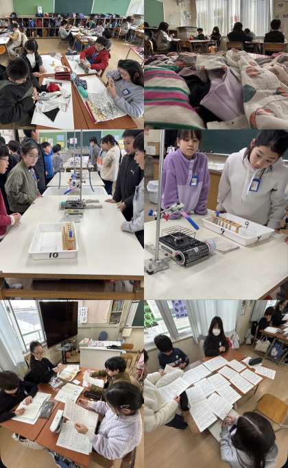 図工では、使わなくなった布や、麻ひもなどの身辺材を利用し、その材質に合った表現で絵に表しました。理科では、水の温まり方について実験を通して学習しました。国語では、アンケートを自分たちで考え、集計し、グラフに表します。