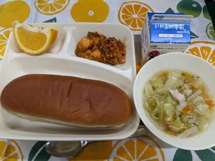 3月4日(火)の給食は「とうふのミートグラタン、じゃがいもと野菜のスープ、はっさく、黒糖パン、牛乳」です。