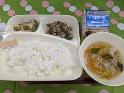 3月5日(水)の給食は「豚肉と野菜のいためもの、五目汁、よもぎだんご、ごはん、牛乳」です。