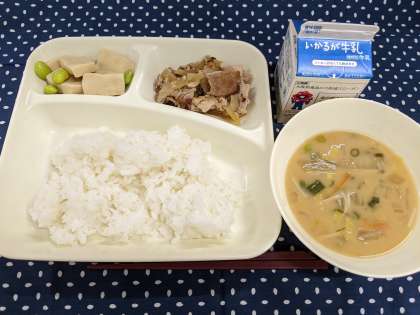 3月10日(月)の給食は「豚肉のしょうが焼き、みそ汁、高野どうふの煮もの、ごはん、牛乳」です。