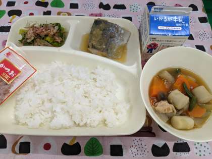 3月12日(水)の給食は「さごしのおろしじょうゆかけ、さといもと野菜の含め煮、なのはなのおひたし、ごはん、牛乳」です。