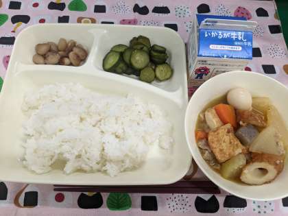 3月13日(木)の給食は「関東煮〈卵除去食〉、とら豆の煮もの、きゅうりの梅風味、ごはん、牛乳」です。