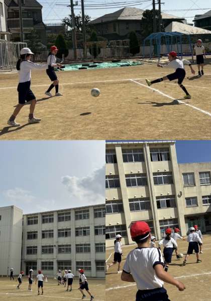 体育では、サッカーの試合が続いています。どうすればパスが繋がるか、点が入るか、チームメイトで考えながら少しずつレベルアップしていきました。