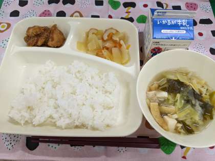 3月17日(金)の給食は「鶏肉の八丁みそだれかけ、五目汁、ちくわとだいこんのいため煮、ごはん、牛乳」です。