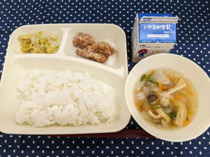 4月10日(木)の給食は「鶏肉のたつたあげ、五目汁、キャベツの梅風味、ごはん、牛乳」です。