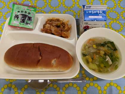 4月11日(金)の給食は「じゃがいものミートグラタン、レタスのスープ、ソフト黒豆、おさつパン、牛乳」です。