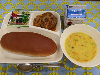 4月16日(水)の給食は「煮こみハンバーグ、コーンスープ、豆こんぶ、黒糖パン、牛乳」です。