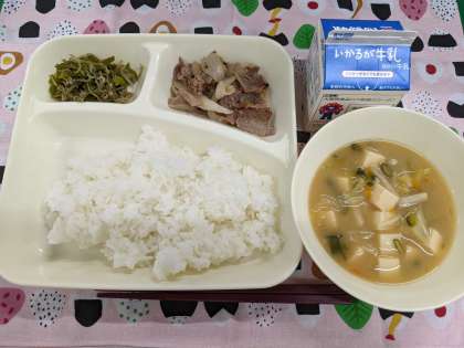 4月17日(木)の給食は「豚肉のしょうが焼き、とうふのみそ汁、じゃこピーマン、ごはん、牛乳」です。