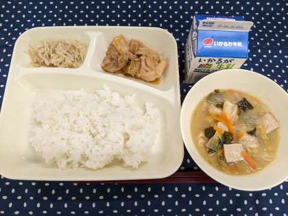 4月21日(月)の給食は「焼きとり、みそ汁、もやしのゆずの香あえ、ごはん、牛乳」です。