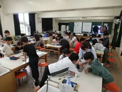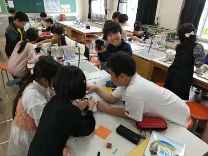 5年生が、発芽したインゲン豆を苗ポットに植えていました。
