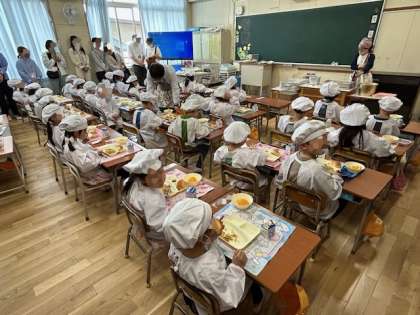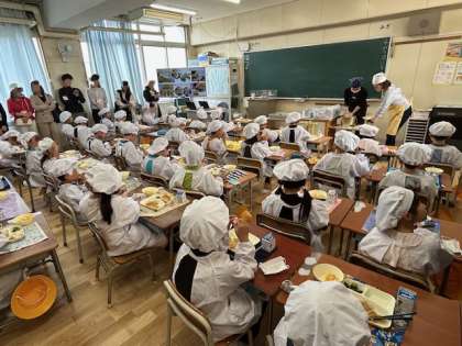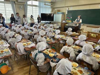 担任の先生と一緒に給食の準備をたり、献立の話を聞いたりしました。