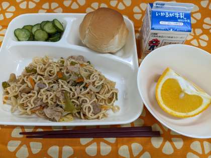 4月25日(金)の給食は「焼きそば、きゅうりのしょうがづけ、あまなつかん、ミニコッペパン、牛乳」です。