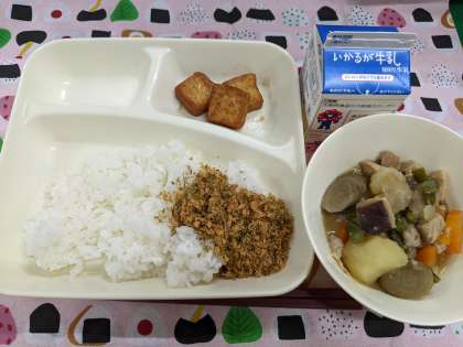 4月28日(月)の給食は「鶏肉とじゃがいもの煮もの、あつあげのしょうゆだれかけ、紅ざけそぼろ、ごはん、牛乳」です。