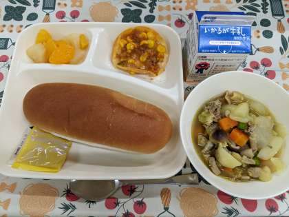 5月1日(木)の給食は「豚肉と野菜のカレースープ煮、変わりピザ、ミクスフルーツ(缶)、コッペパン、アプリコットジャム、牛乳」です。