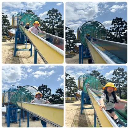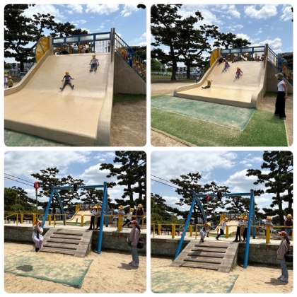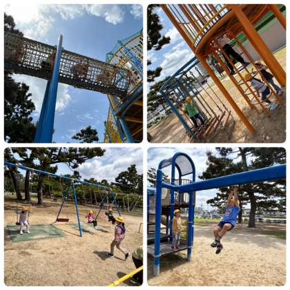 公園内の遊具で遊んでいます。みんな笑顔いっぱいで楽しそうです。就学前の小さな子どもたちが一緒に遊具を使えるように注意しながら遊んでいます。