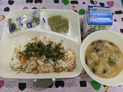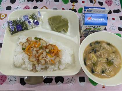 5月13日(火)の給食は「かやくご飯、みそ汁、まっちゃういろう、牛乳」です。