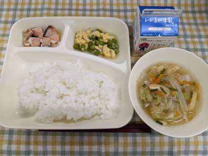 5月15日(木)の給食は「さけのみそ焼き、五目汁、えんどうの卵とじ〈卵除去食〉、ごはん、牛乳」です。