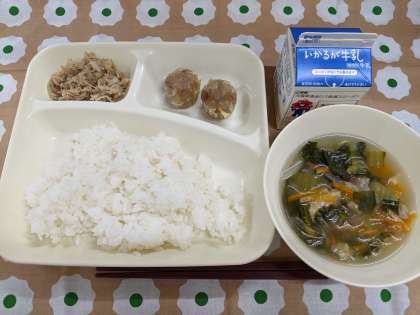 5月16日(金)の給食は「焼きシューマイ、鶏肉とはるさめのスープ、ツナともやしのいためもの、ごはん、牛乳」です。