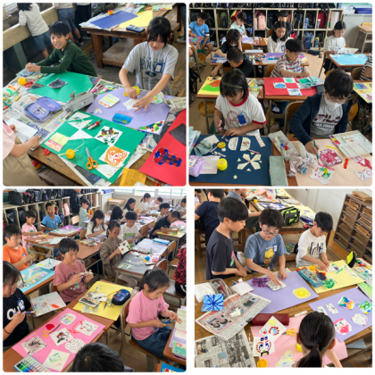 図画工作科「絵の具でゆめもよう」では、これまでにつくった作品を思いのままに大きな画用紙に貼り、作品を仕上げました。作品をつなげたり、さまざまな形に切り取ったりして、ひとりひとりのゆめもようを完成させていました。