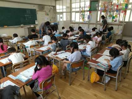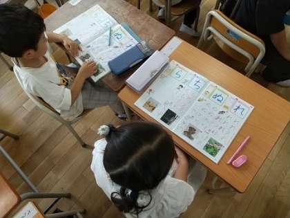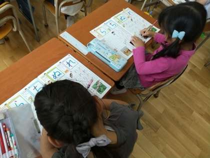 文字の学習もずいぶん進んできました。今日は「ぬ」というひらがなを学習していました。お手本の文字の形をよく見て、ていねいに書くことができていました。