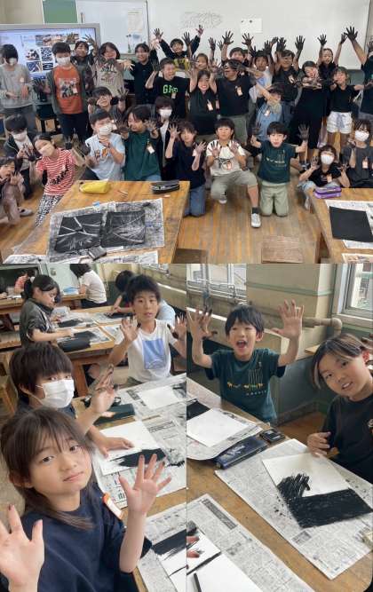 図画工作では、コンテパスで紙を真っ黒に塗りつぶし、消しゴムで消したり、コンテパスで書きたしたりしました。どのような模様が表現できるのか完成が楽しみです!活動を続けると手も真っ黒になりました、、