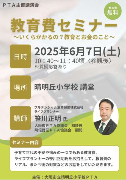 長年PTA活動に携わって来られ、現在も大阪市PTA協議会相談役・阿倍野区PTA協議会顧問でおられる笹川正明氏(プルデンシャル生命保険株式会社ライフプランナー)をお招きし、「教育費セミナー」を開催します。
