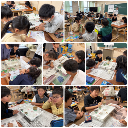 理科「流れる水のはたらき」では、土のつぶの大きさの違いと水のしみ込み方の関係を調べました。