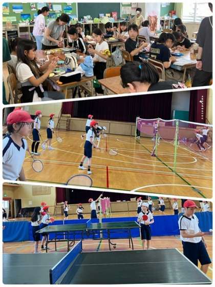 講堂では、バトミントンのネットや卓球台の準備・片付けも慣れてきました。みんなで素早く準備をして、活動の時間に集中しています。