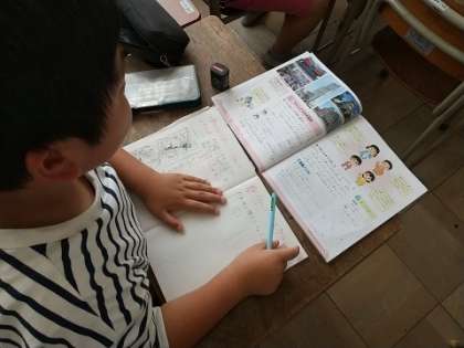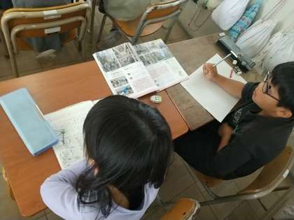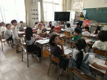 教室の前と後ろで2人の子どもがとっているポーズの大きな看板がある場所、わかりますか。
