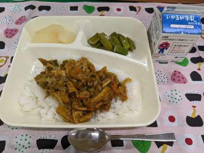 6月13日(金)の給食は「和風カレー丼、オクラの甘酢あえ、和なし(缶)、牛乳」です。