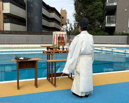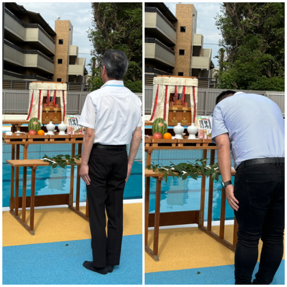 本日8時より、阿倍王子神社から宮司さんにご来校いただき、梅雨晴れの中プール修祓式を行いました。