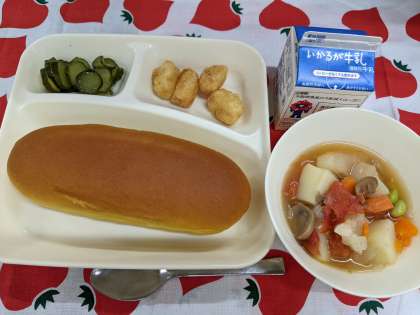 6月16日(月)の給食は「いかてんぷら、フレッシュトマトのスープ煮〈大豆除去食〉、きゅうりのバジル風味サラダ、パンプキンパン、牛乳」です。