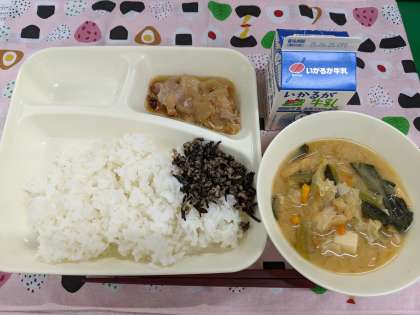 6月19日(木)の給食は「鶏肉の甘辛焼き、みそ汁、魚ひじきそぼろ、ごはん、牛乳」です。