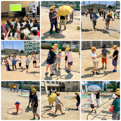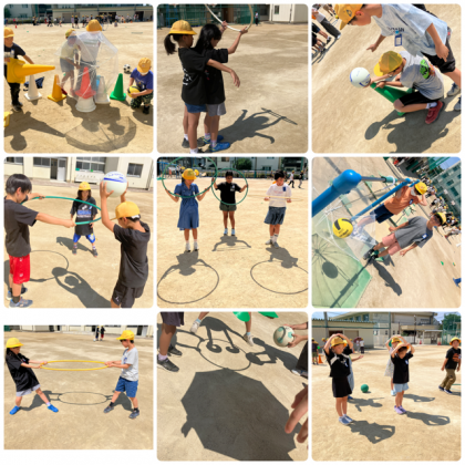 図画工作科「光とかげから生まれる形」では、4年生全体で運動場に出て体やコーンなどを使ってかげをつくり楽しみました。
