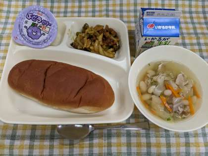 6月23日(月)の給食は「カレーマカロニグラタン、てぼ豆のスープ、ぶどうゼリー、黒糖パン、牛乳」です。
