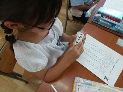 1年生が計算カードで、足し算の計算にくり返し取り組んでいます。