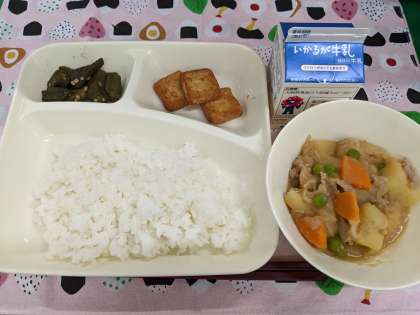 7月4日(金)の給食は「みそ肉じゃが、あつあげのしょうがじょうゆかけ、オクラのおかかいため、ごはん、牛乳」です。