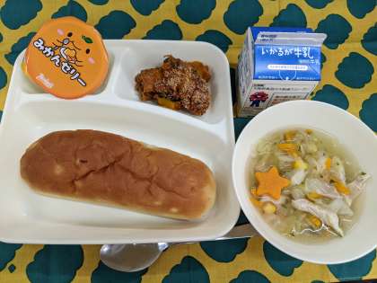 7月7日(月)の給食は「かぼちゃのミートグラタン、スープ、みかんゼリー、おさつパン、牛乳」です。