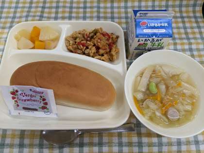 7月14日(月)の給食は「押麦のチキンパエリア、ウインナーとキャベツのスープ〈大豆除去食〉、ミックスフルーツ(缶)、コッペパン、いちごジャム、牛乳」です。