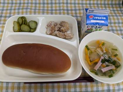 7月16日(水)の給食は「鶏肉のからあげ、ハムととうがんの中華スープ、きゅうりのピリ辛あえ、黒糖パン、牛乳」です。