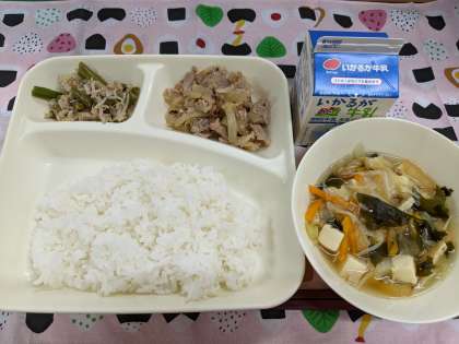 7月17日(木)の給食は「豚肉のしょうが焼き、五目汁、ツナと野菜のいためもの、ごはん、牛乳」です。