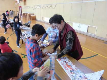 11月1日(金)2・3時間目、1年生が晴寿会の方から、昔から伝わるあそびを教えていただきました。紙鉄砲やこま回し、お手玉、ぶんぶんゴマなどの作り方や遊び方を教わり、楽しい時間を過ごしました。