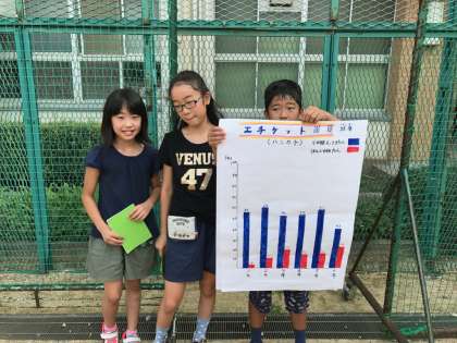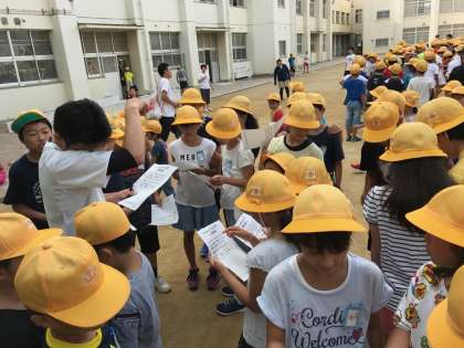今日の児童朝会で保健委員会、ユネスコ委員会の報告が